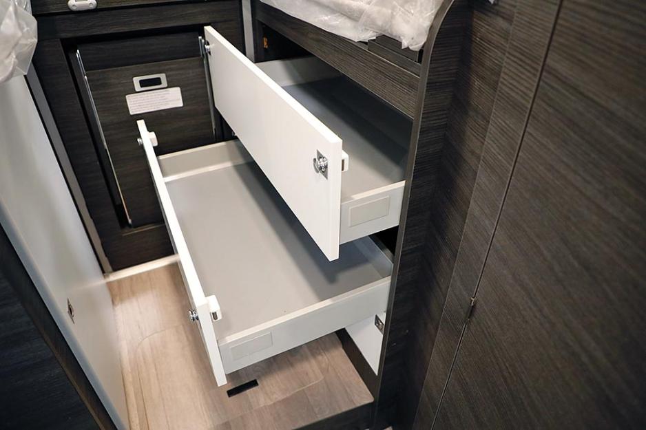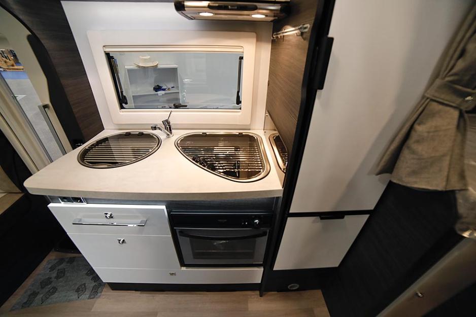 Vår testbil var utstyrt med komfyr på kjøkkenet. Mange er glad i det, men det spiser av lagringsplassen på et meget kompakt kjøkken. Parallelt med komfyren er det to smale skuffer, og en stor bred skuff helt nederst. Når denne skal åpnes må man stå ved siden av kjøkkenbenken, noe som er upraktisk. Som man kan forvente er det relativt liten arbeidsflate, men de fleste vil fint kunne fikse alle måltider her.