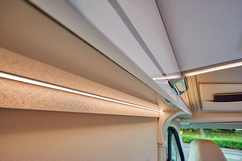 Vi vil også tro at materialet bidrar til å dempe lyder. At det i tillegg er stilig gjort, og at Karmann Mobil har brukt designkrefter på å få det til å harmonere, er veldig tydelig. Det råder harmoni med lyse nyanser av offwhite, beige og kaffe-farger.