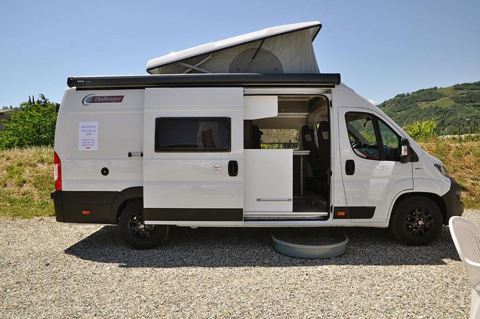 Modellen vil kunne leveres i to utstyrsnivåer: Start Edition eller toppmodellen Graphite Premium. En viktig ny mulighet for familier er at alle Challengers bybobiler nå kan leveres med pop-up tak og soveplass til to. I dette lille rommet på taket er det luftemuligheter med myggnetting. Her finner du også noe lagringsplass og USB-kontakt.