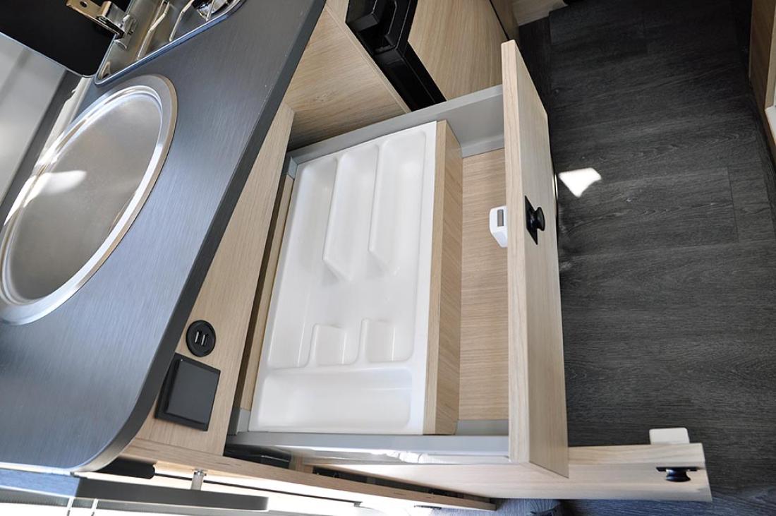 Den andre store nyheten, som vi aldri har sett før, er at lagringsplassen bak i bobilen har blitt til et eget rom, med full høyde og en egen inngangsdør! Her er det plass til to sykler, her er det hyller og mye smart lagringsplass. Perfekt for den aktive som ønsker plass til våtdrakter, treningstøy, kiteutstyr og mye annet. Men du kan også nyttiggjøre deg av rommet om du har med kjæledyr, eller bare liker å storhandle.