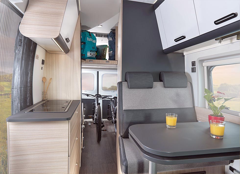 Med en ekstern lengde på 5,41 meter har nye 55SP alt du trenger til en ferie om bord. Den tverrstilte senga har to soveplasser, og det er sitteplass til fire. Den andre nyheten fra Sun Living er betydelig større, og er nok mer aktuell for det norske markedet. Med en lengde på 6,36 meter og en høyde på 2,78 kan fire personer både reise og sove. V 65XL har med sine 218 cm høyde ekstra luft å by på. Det høye taket gir plass til en senkeseng, noe som igjen gir store muligheter til å frakte selv store gjenstander. Begge modellene varmes opp av en Truma Combi D.