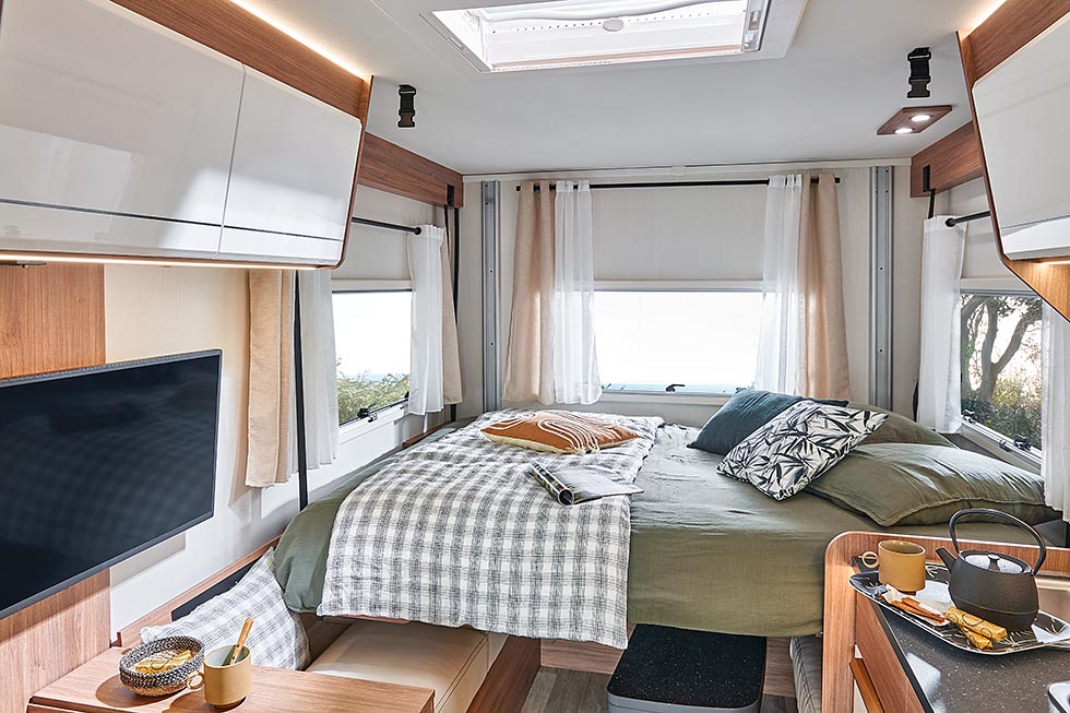 Pilotes største modellnyhet for 2022 er den romslige u-sofa modellen P696U. Hovedsengen her er senkesengen, som er plassert over den romslige sofagruppen. Det er ikke den eneste nyheten fra Pilote. De har også en ny bybobil kalt V633M med fleksibel lastemulighet, takket være en høydejusterbar dobbeltseng bak.