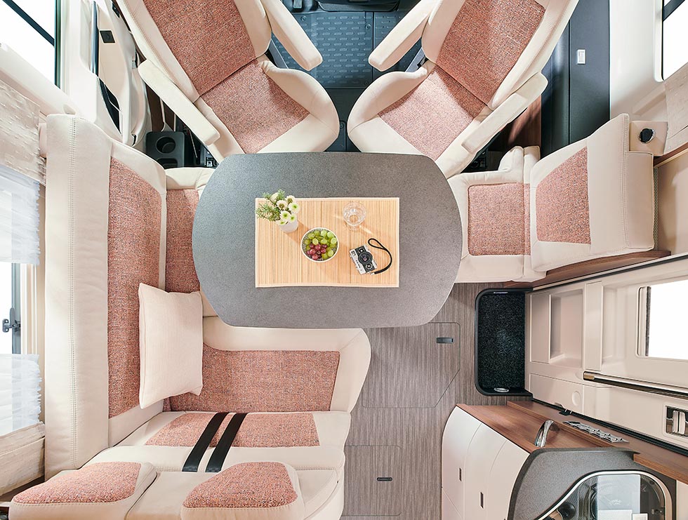 Jeg er neppe alene om å mene at kvalitetsprodusenten Carthago har en relativt konservativ interiørstil. Det er i seg selv ikke noe galt i det selvsagt. Men nå blir det større variasjoner på modellserien som er selve ryggraden i produsentens portefølje, Chic C-line. Det er en god nyhet for mange. Bare navnet på nyheten sier en del: Linea progressiva. Det nye interiørdesignet byr blant annet på tofargede tekstiler, og en blanding av matte og blanke elfenbensfarger. Interiørfargen Linea moderna har også noe elfenbensfarger, i kombinasjon med akasiefargede overskap. Linea classica har mer dempede møbelfarger. På helintegrerte C-line finnes det også et Linea Siena-alternativ med kastanjefargede møbler.