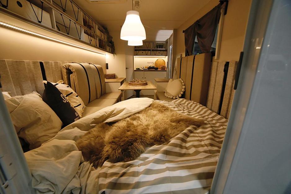 Den nye serien kommer med tre modeller som i utgangspunktet har lik interiørløsning, men tre ulike lengder på 360, 420 og 450 cm. Her er det en bakerst en sittegruppe som res opp til seng. Og det er her forskjellen på de tre modellene ligger. Jo lenger vogn, jo mer sitte- og soveplass. At det er en stor dør på bakveggen, er ikke tilfeldig. Det gir fotovennlige muligheter fra sengen. Perfekt for en ung Instagram-generasjon.