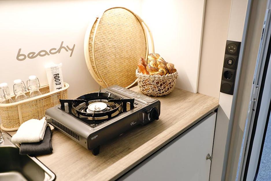 Vi så vognen både på Caravan Salon i Düsseldorf og på Caravanmessen i Lillestrøm. Bildene er fra den norske messen, for i Düsseldorf var det rett og slett vanskelig å komme til, da publikumskøen var lang. Vogna har ikke et tradisjonelt kjøleskap eller koketopp. I stedet kan den utstyres med en kjøleboks og et portabelt gasskokeapparat. Tilsvarende kan den leveres med et portabelt Porta Potti, som kan plasseres i garderoben.