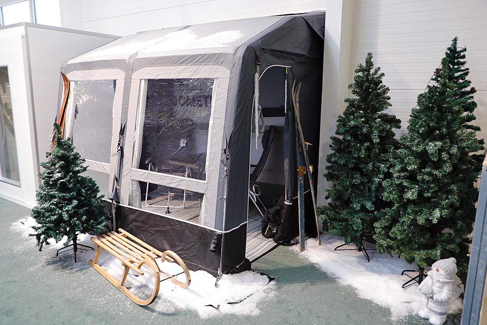 Vi har liten grunn til å tvile på Peter Outzen, direktør i Camping Agenten, når han forteller at dette er Europas største permanente utstilling av Kampa/Dometics fortelt. Dette er det nærmeste enhver norsk caravanforhandler kan komme en godtebutikk.