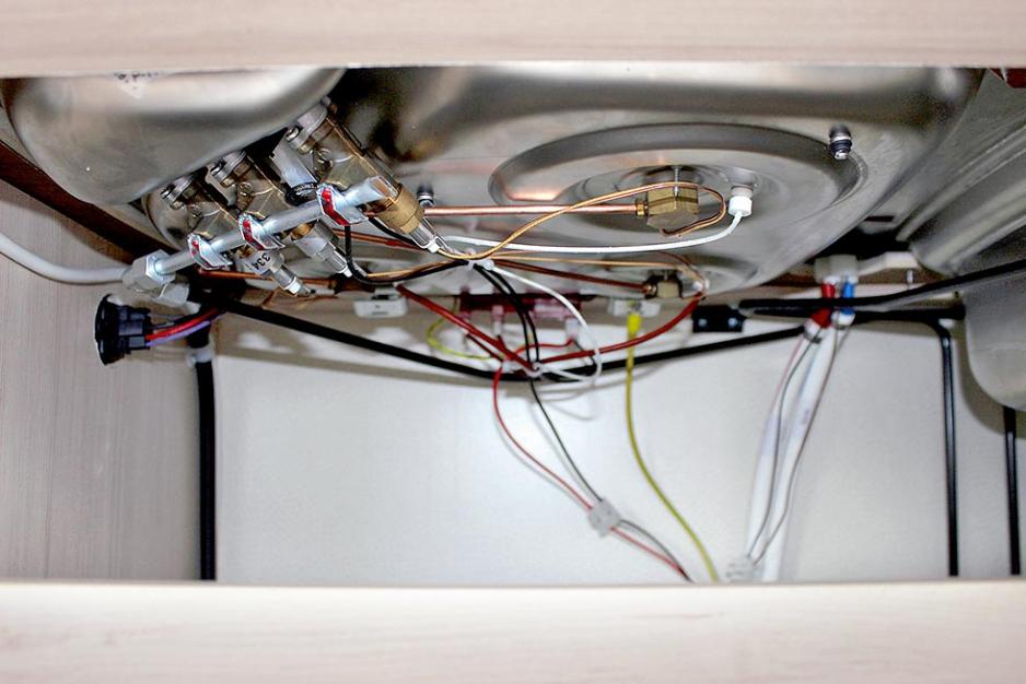 Vannkranen er plassert mellom glasslokkene til bluss og kum, og må stilles rett når lokkene vippes opp. Står selve kranen på skrå, tar lokket denne med seg opp, og vannet fosser ut mellom kum og bluss. Men dette venner man seg fort til å sjekke etter et par uhell. Kjøleskapet fra Dometic står til høyre for benken, det er et RML 8330, såkalt «slim tower», da det er betydelig smalere enn de vanlige skapene. Kjøleskapet er 135 liter stort med et lite fryseskap på 12 liter plassert inne i skapet - som kan tas ut om ønskelig. Kjøkkenet har ikke avtrekksvifte, men et luftevindu og en takluke like i nærheten gjør jobben. Det er LED-spotter i tak og under overskap.