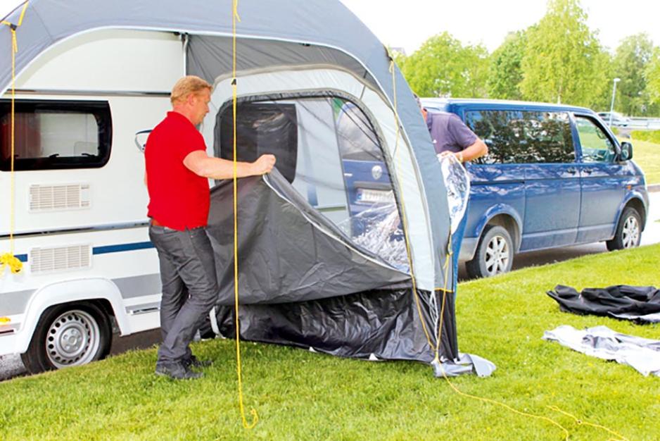 – Du trenger ikke parkere vogna på gress selv om forteltet bør settes opp på mykt underlag, og det er heller ikke noe problem at det er høydeforskjell på vogna og teltet - slik som her, forteller Andersen.