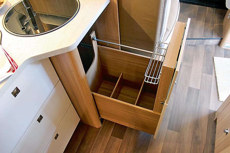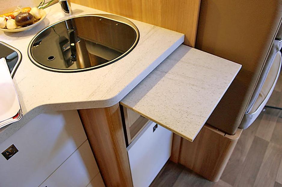 Vi har ofte bemerket Dethleffs fine overskap på kjøkkenet, høye med sidehengslede dører. Her var det benyttet overskap av samme type som de andre i bilen. Egentlig greit tilgjengelige, men ikke så romslige. Det var ikke avtrekksvifte, ei heller takluke over benken. Den store takluken over sittegruppen, pluss luftevinduet, må tas i bruk når det stekes bacon (for eksempel). Som nevnt er kjøleskapet et Slim Tower fra Thetford på 142 liter, med innebygget frys på 15 liter.