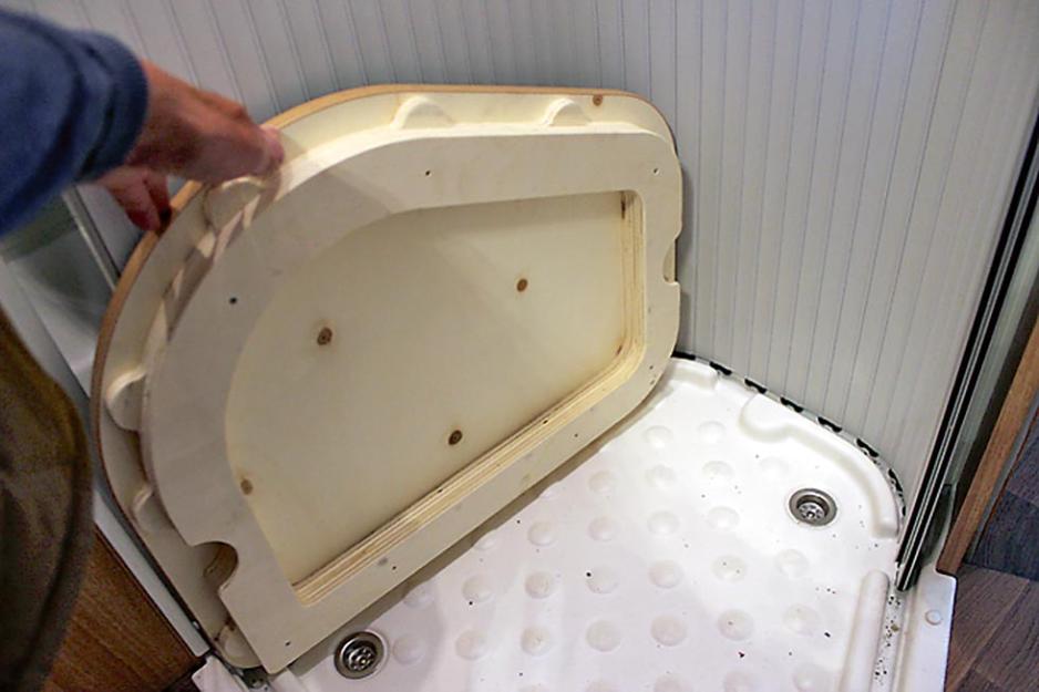 Toalettrommet og dusjen er plassert på hver side av midtgangen, i forkant av soverommet. Toalettromsdøren kan lukkes opp og stenger dermed framover i bilen. I tillegg er det en foldedør mellom dusj/ toalettrom og sengene bak. Fungerer bra som sanitæravdeling! Toalettrommet måler 94 x 80/58 x h 188 cm lukket, og fungerer bra. Men om du skal vaske deg i ansiktet må du bøye deg ned og døren må lukkes opp, hvilket ikke er noe problem når det stenges av. Dusjen måler 82 x 68 x h 194 cm, og gir tilstrekkelig plass. Bra så langt, men vi har et lite ankepunkt på oppbevaringsplassen. Et lite veggskap uten hylle er alt som egner seg for oppbevaring under kjøring. På undersiden er det hyller med lav kant som bare egner seg for pyntegjenstander når bilen står stille. Her var det et vindu i en fransk utgave av bilen. Det var heller ikke skap under vasken, så dette var et minus.