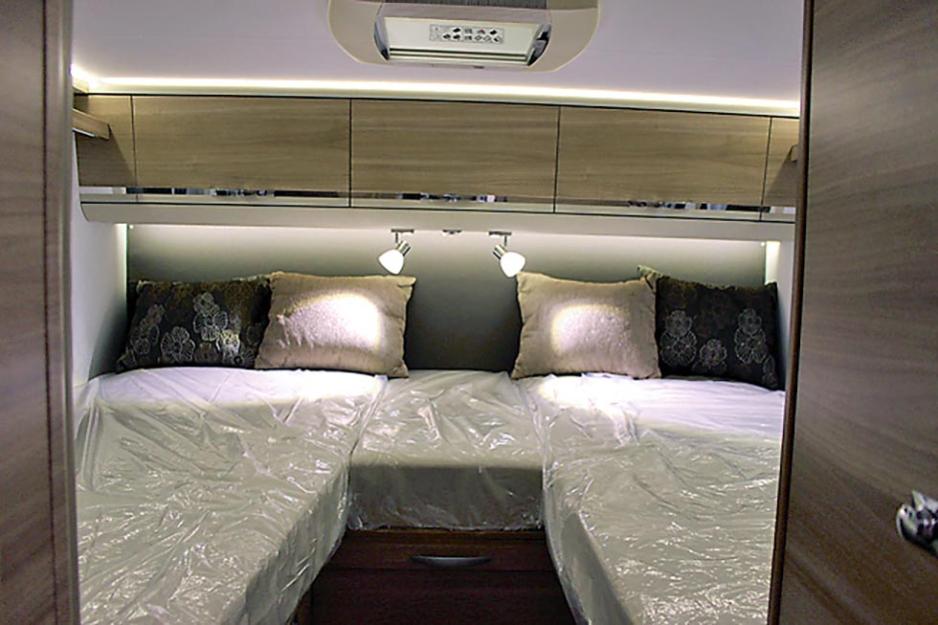 Begge enkeltsengene bak måler 205 x 85 cm. Det er overraskende lange og brede senger til en slik kompakt bil å være. En tolv centimeter tykk madrass ligger på fjærende treribber. Fra gulvet og opp til madrassen er det 69 cm som er en bekvem høyde. Mellomrommet mellom madrassene kan fylles ut i en lengde av 177 cm fra hodeenden og ned. To klesskap er festet på veggen over fotenden av sengene. Det bredeste bygger 77 cm fra vangen mot kjøkkenet ved fotenden av senga og innover. Og det i en høyde av 40 cm over madrassen. Forsøk viste at det fortsatt var mulig å trekke opp knærne, det så verre ut enn det var. På høyre side bygget skapet 57 cm innover senga.