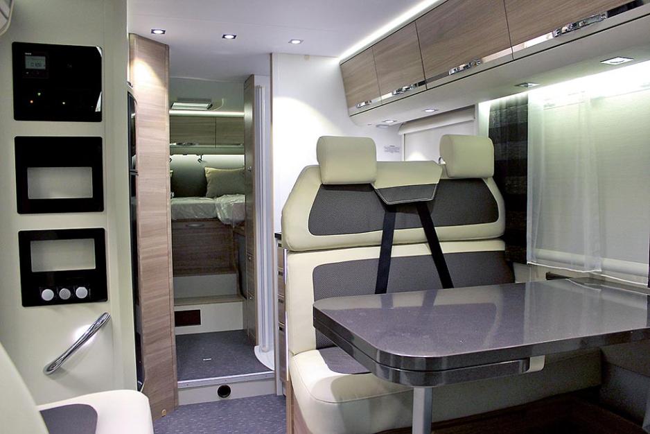 Sittegruppen består av toseter bak med belter, sidesitter og to vendbare forstoler. Altså er det plass til fem. Bordet måler 106 x 45/55 cm og kan forlenges med en klaff med 38 cm. I baksetet er vanntanken på 127 liter plassert, sammen med Shurflopumpen. I sidesitteren er gasskassen for en gassflaske og noen el-komponenter plassert.