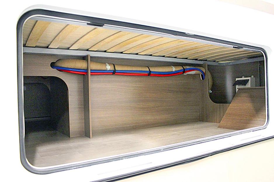 Bilen er bygget på Fords lave spesialchassis med bred sporvidde bak, et konsept de har lånt av en stor konkurrent. På undersiden kunne noen gjennomføringer trenge litt ekstra tetningsmiddel, men det følges opp i klargjøringen blir vi fortalt. Her er det ingen garasje, det gir lave senger innvendig og grei bagasjeplass under begge sengene, tilgjengelig utenfra og innenfra. Bilen var utstyrt med fester for sykkelstativ bak, så dette kan raskt henges på.