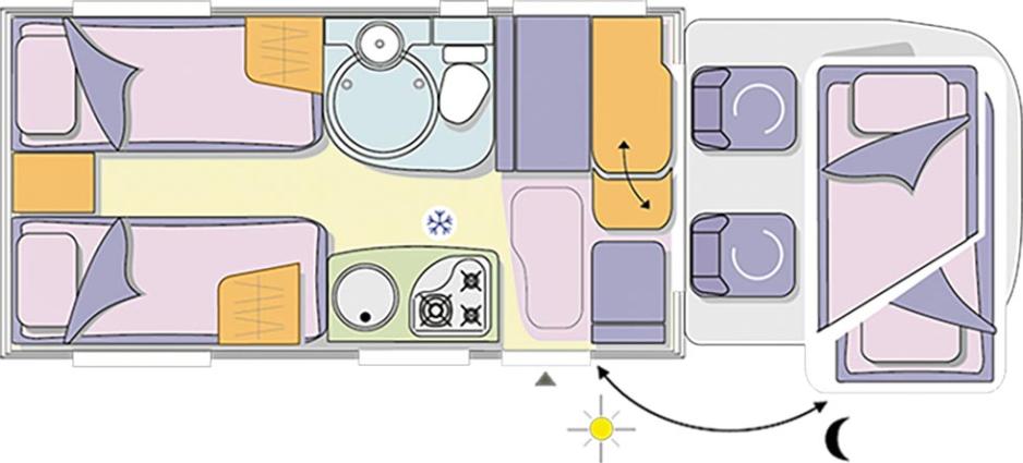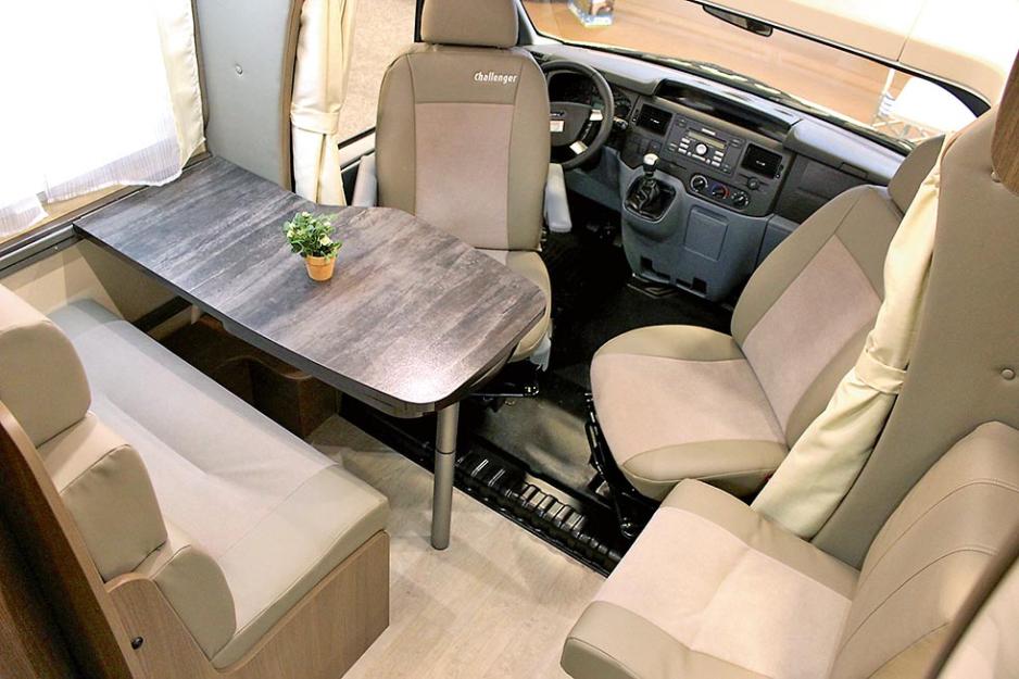 Baksetet er spesielt kort i setet og litt for rett i ryggen. Ikke helt vellykket om du skal sitte der lenge, for eksempel under kjøring. Et stort takvindu i førerhuset gir godt lys over sittegruppen som ellers vil virke litt trang. Omgjort til seng måler denne 215 x 52/100 cm. Benyttes de vendbare forstolene vil to personer uansett ha det bra i denne sittegruppen.