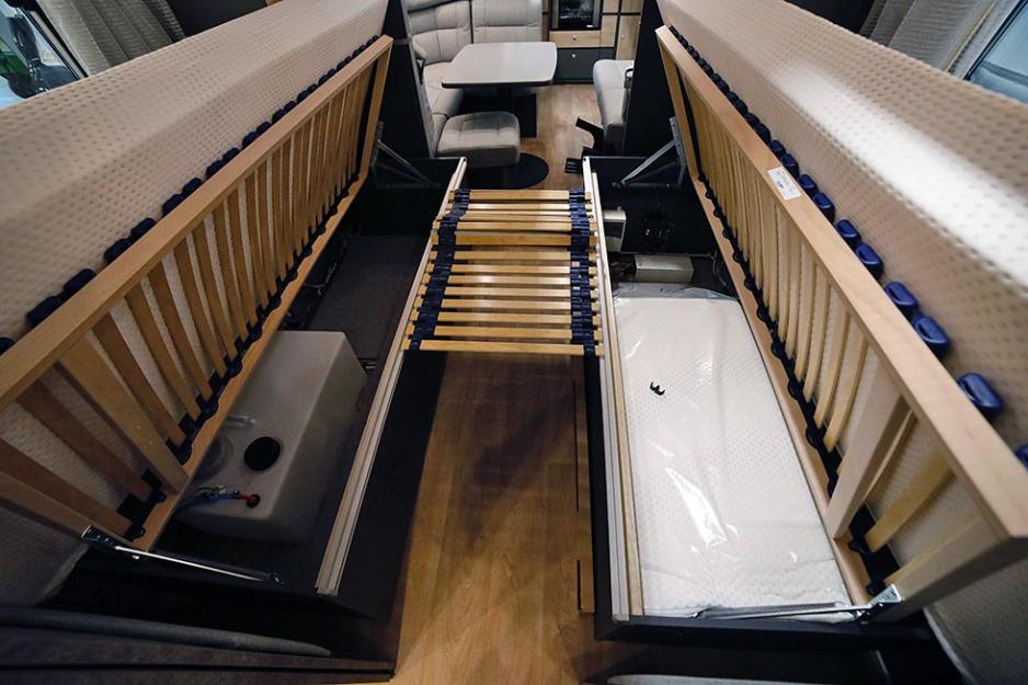 Når vi kommer inn i vognen, ser vi at den har en klassisk interiørløsning. Forfra og bakover er det kjøkken, stue, soverom og bad – på rekke og rad. Det er to enkeltsenger på soverommet. Det følger med ekstra sengebunn og madrass til å dekke mellomrommet. Dermed kan du lage én gedigen seng på rundt to ganger to meter. Derfor er også antall sengeplasser oppgitt til tre. Men dette er en typisk interiørløsning for to personer.