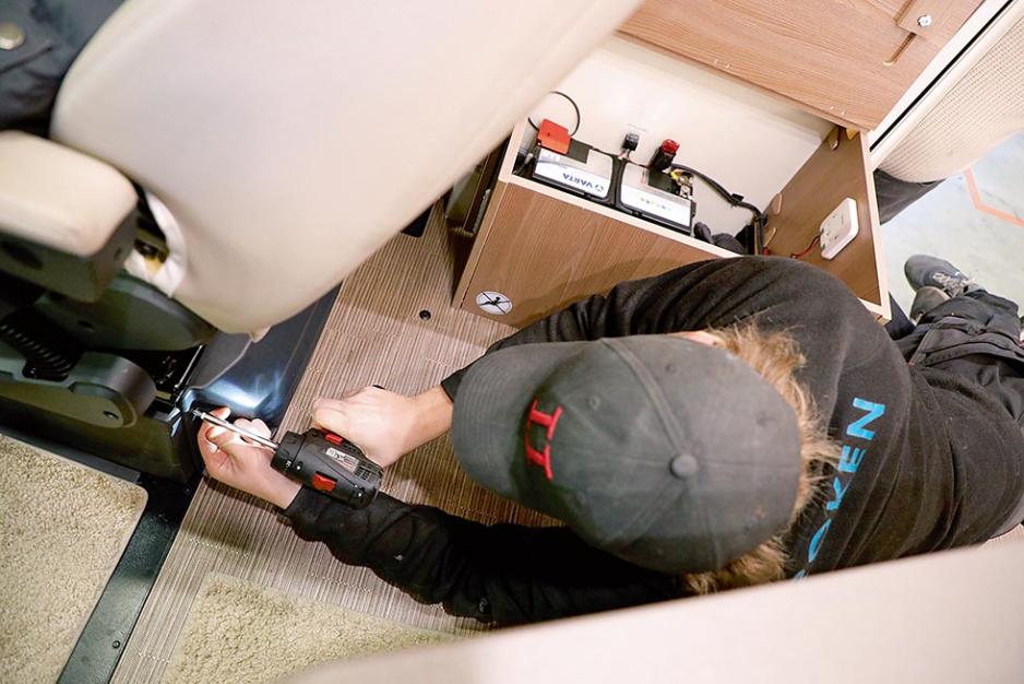 Tiden er kommet for det vi er mest spent på: Montering av fuktsensorerene. Som standard leveres det 12 sensorer i pakken. De forsvinner fort, og gjengen deler erfaringer basert på nettopp denne bobilmodellen. Veggkonstruksjonen er en sandwichplate med aluminium på begge sider. Det gjør at man i praksis ikke kan bruke tradisjonelle fuktmålere ved fukttest, og det blir desto viktigere å treffe godt med plasseringen av de permanente sensorene. Det blir raskt føyd til ekstra sensorer og vi er oppe i 16 stykk før alle er fornøyd.