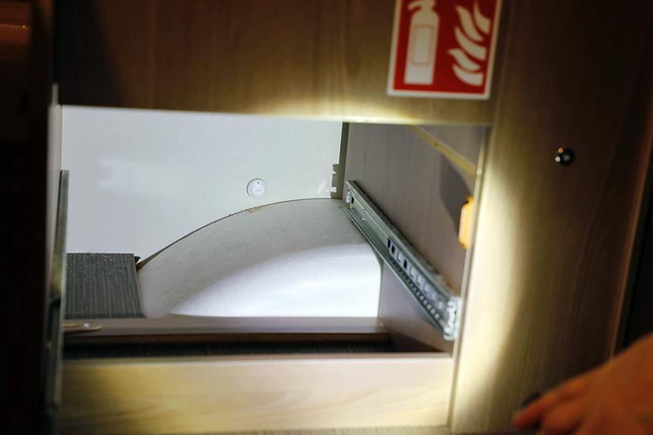 Overgangen mellom chassis og bodel kan være utsatt. Oppunder taket, ved festet til senkesengen, fjernes et gardinliknende stoff og en sensor monteres på både høyre og venstre side.