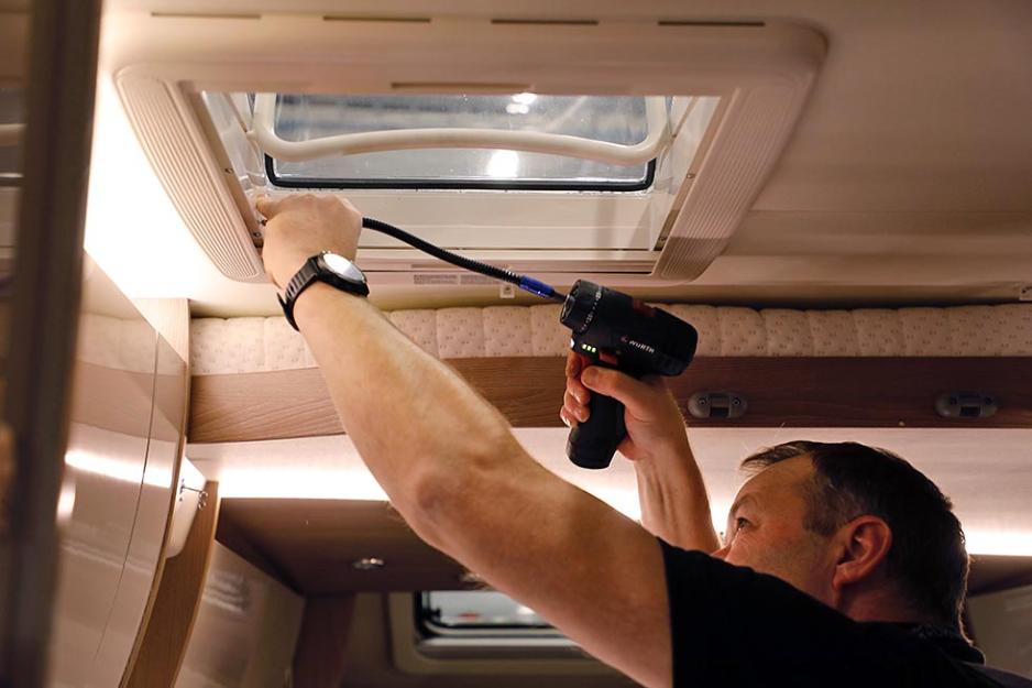Også den store takluken får en sensor, det samme i en mindre takluke lenger bak i bilen. Den fleksible drillforlengeren har et bor som er kuttet i nøyaktig riktig lengde. Ikke minst viktig når man borer i yttervegger.