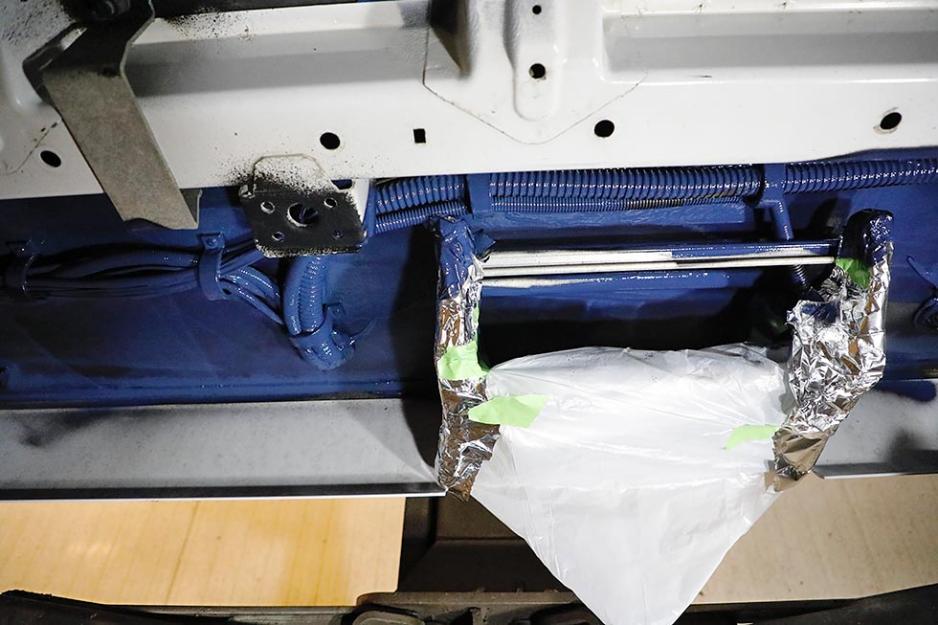 Jeg møter opp tidlig mandag morgen. Da har Tommy i løpet av helgen allerede primet enkelte chassisdeler. Og han har dekket til de områdene som ikke skal få på seg noe midler, som bremseskiver, plastikkdeler, gummiforinger og lignende. Maskeringsteip, plastposer og aluminiumsfolie fungerer greit.