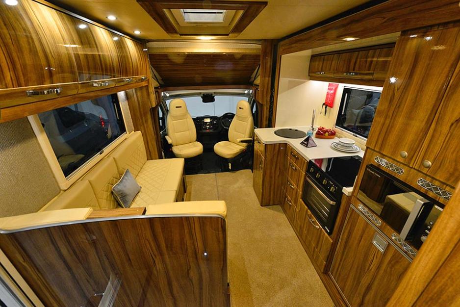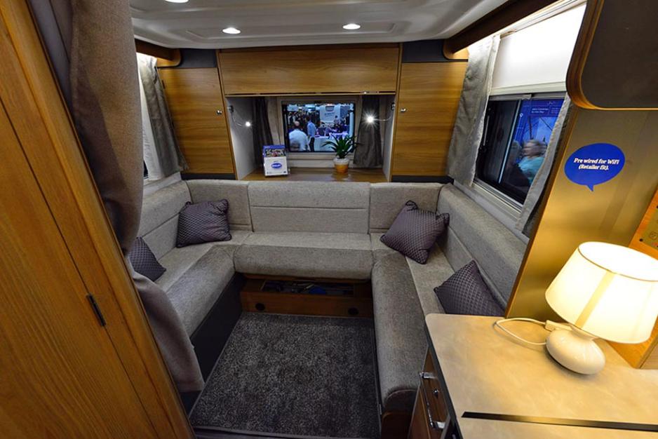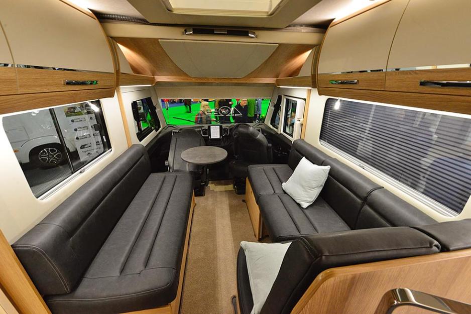 Coachman er et av de mer prestisjefylte caravanmerkene i England. De eies av svenske Kabe og på messen i år ble selskapets første bobiler lansert. De er bygget i Tenhult i Sverige av Kabe, men interiøret er tilpasset britisk smak. På bildet ser vi den uvanlige sittegruppen i Coachman Travel Master 560.