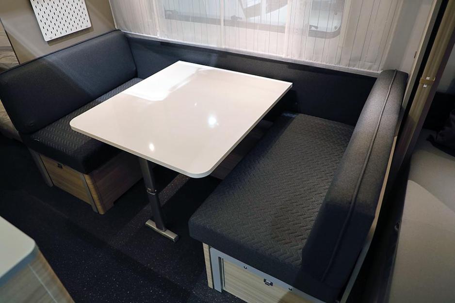 Produsenten kaller interiøret «nordisk stil». Det betyr lyse trefarger og struktur på alle skapdører og skrog til møblene. Tekstilene går i grånyanser, mørkegrått grovt vevd stoff i ryggputen, sitteputen er i en annen nyanse, og er fylt av dekorsømmer. Det går raskt å senke bordet, legge på puter og re opp til en romslig soveplass i sittegruppen. Her kan også to (barn?) sove tipper jeg. I så fall betyr det at denne vogna kan gi soveplass til hele sju personer.