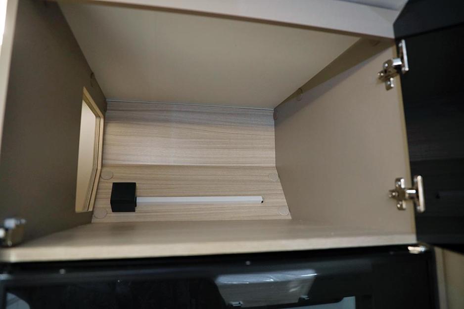 Over sengen er det to store overskap på kortenden, og to mindre på langsidene. Hjørnene er ikke utnyttet, men påskrudde deksler antyder at Adria har plassert noen tekniske installasjoner her. To spot-leselys, dobbel USB-kontakt og noen åpne hyller er praktiske detaljer som gjør dette til et ekte soverom. Et forheng i full vognbredde bidrar til privatliv.