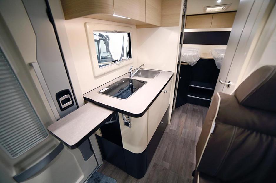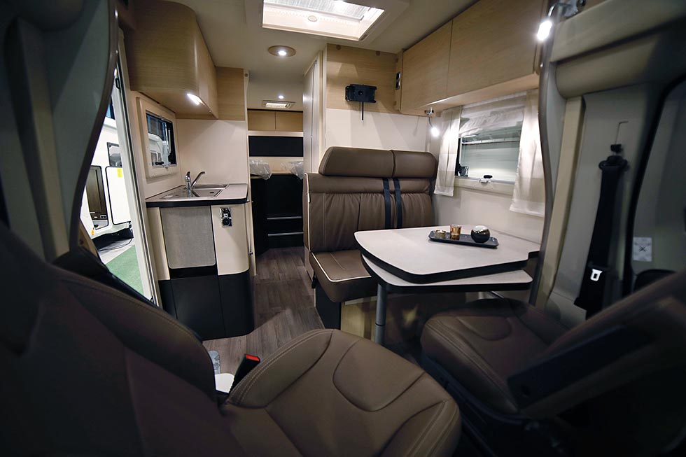 Idet jeg skriver dette, sitter jeg i passasjersetet. Som man etter hvert har blitt vant til på moderne bobiler, så sitter jeg svært godt. Setet er i tillegg i skinn. Bordet har dobbel plate, så når jeg bretter det ut, får jeg også tilgang til bordplass for en datamaskin eller en middagstallerken. Bordet festes i en skinne på veggen, og har et ben i ytterkant. Det gir god stabilitet. Her er også en lavere skinne man benytter om man skal re opp til soveplass i sittegruppen. Bordoverflaten har et uvant matt belegg. Kanskje en slags antisklibehandling? Ekstraplaten er romslig, men blir hengende litt i nedoverbakke - ikke noe stort problem, men her gjelder det å ikke fylle cornflakes-bollen for full.