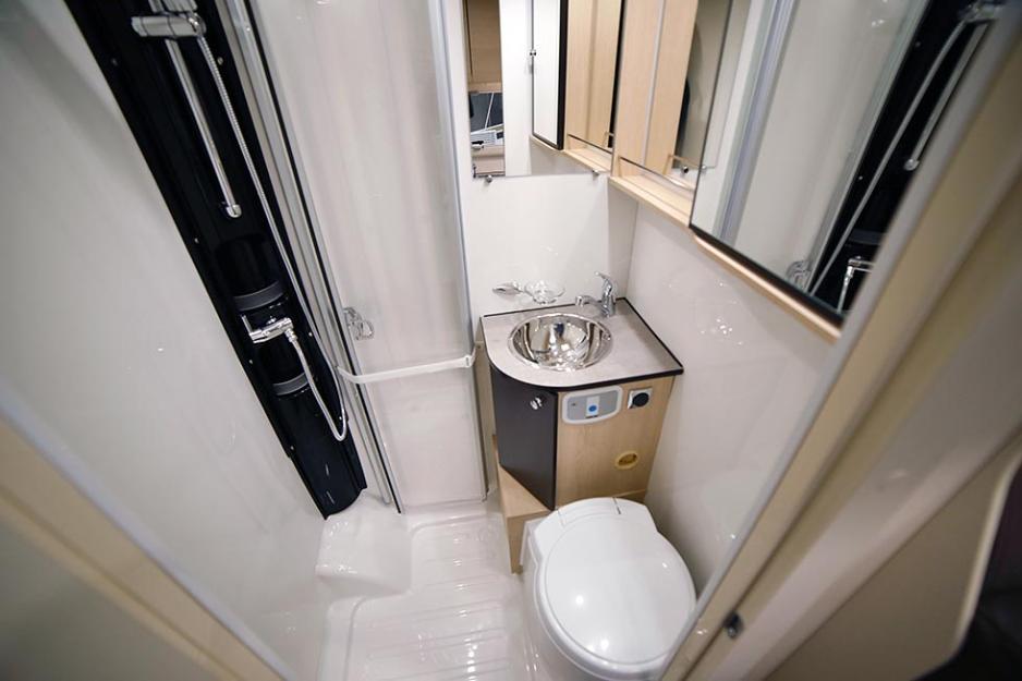 Det at man får utnyttet dusjplassen, betyr god benplass på toalettet og god armsleng rundt vasken. Når du skal dusje, brettes dusjveggen ut og gir et effektivt dusjrom på romslige 60x80 cm. I tillegg er nesten hele gulvflaten tilgjengelig, da kun en liten del av hjulbuen er plassert her. En takluke sørger for nødvendig luftsirkulasjon. Har du husket å vri toalettet sideveis, får du en riktig stor og komfortabel dusj!