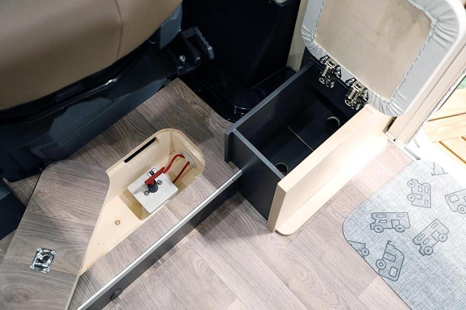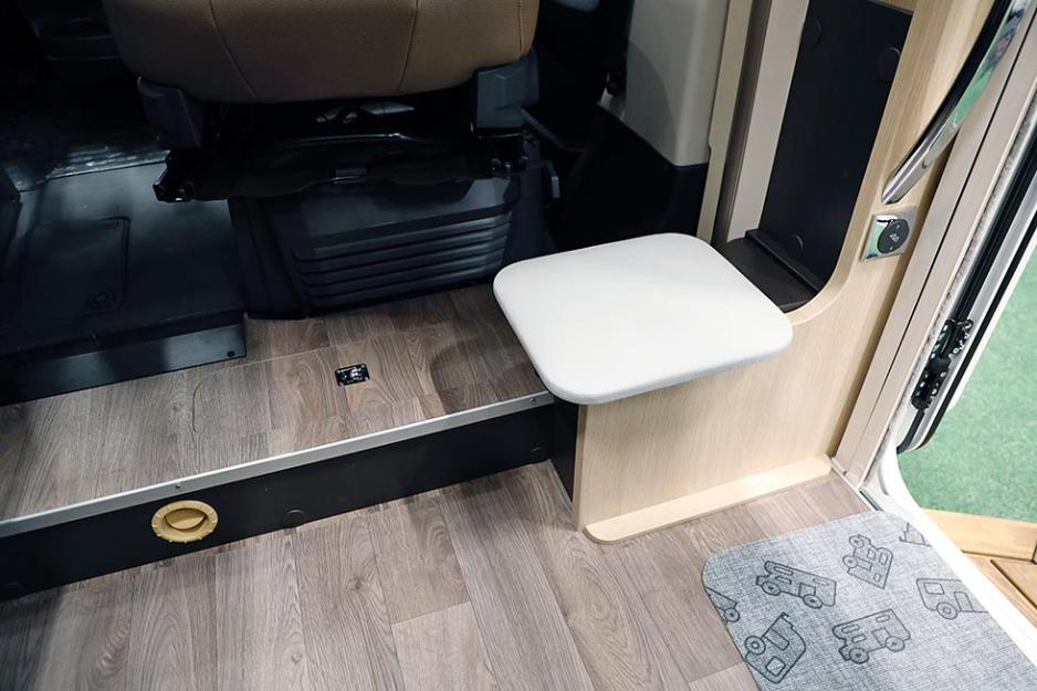 Det er et takvindu med åpningsmuligheter i front av bilen, og en takluke over de to bakre sitteplassene. Det er ingen senkeseng i bobilen, og det gir en god luftfølelse. Om man sjelden er mer enn to på tur, er det en luftigere løsning å re opp sittegruppen en sjelden gang, i stedet for å ha en fastmontert senkeseng som tar vekk naturlig lys, vekt og takhøyde. Rett til høyre for døren er det en bitteliten puff. Under lokket er det lagringsrom. Jeg må si jeg er usikker på hva produsenten har tenkt at denne skal brukes til, men samtidig gjør den ikke så mye ut av seg, og som fotskammel fungerer den.