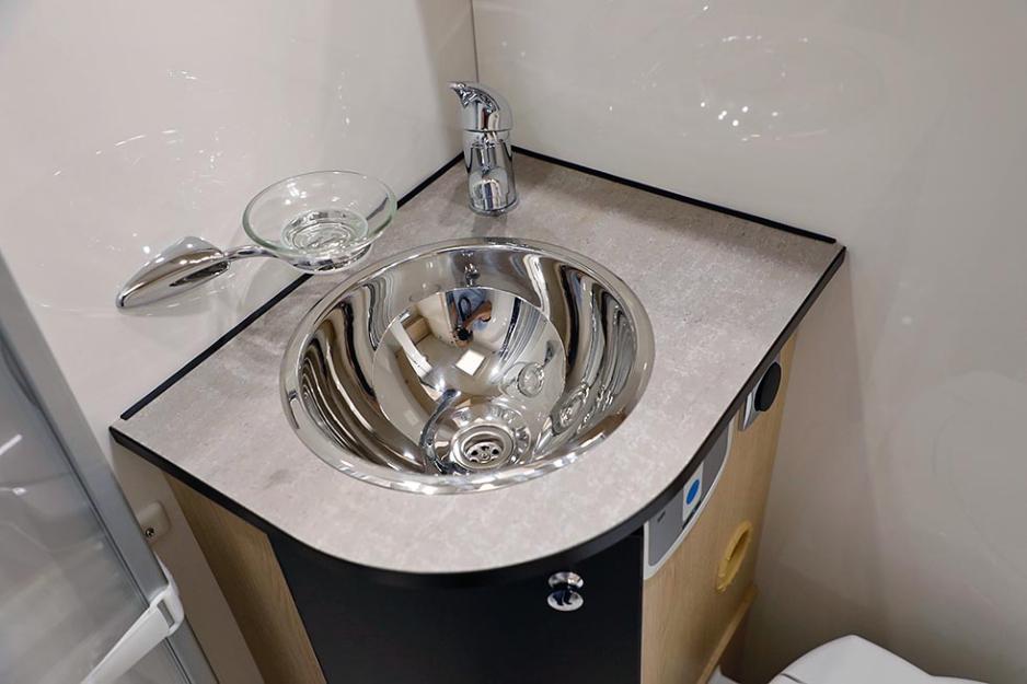 Dette er et bad hvor det hadde vært fristende å lage en såkalt «smart»-løsning. Det har ikke Autostar gjort. Det betyr at gulvarealet på badet er relativt stort i forhold til bilstørrelsen.
