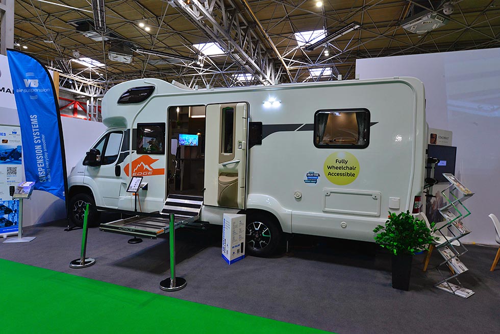 Det engelske selskapet Coachbuilt har spesialisert seg på å handikapptilpasse bobiler fra Swift. På årets caravanmesse i Birmingham viste de fram en bobil tilpasset rullestolbruk.
