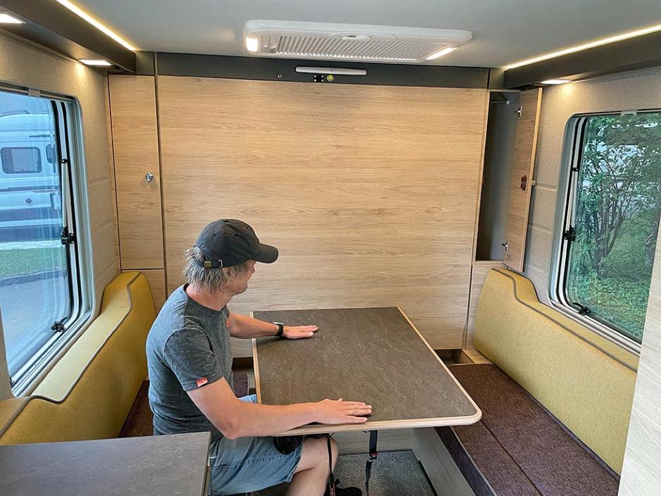 Tabbert har gjerne et meget stilig interiør, som nesten kan være litt overdådig. Det har jeg sett flere ganger før. Det jeg ikke har sett før var kompakte og sjarmerende Pep Pantiga 390 WD. Her er det ingen fast seng, men en skapseng, eller mer korrekt en veggseng for to. Når den ikke er i bruk kan du vippe ned bordet, som er festet i veggen (som jo egentlig er sengen).