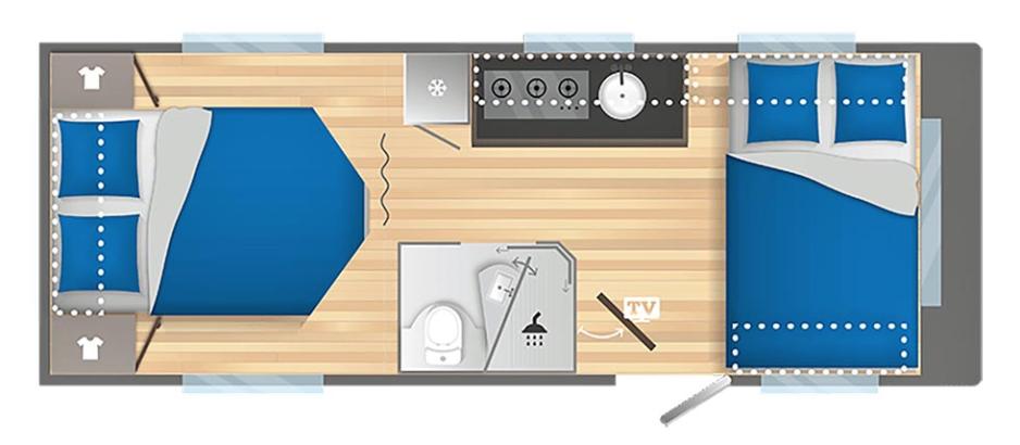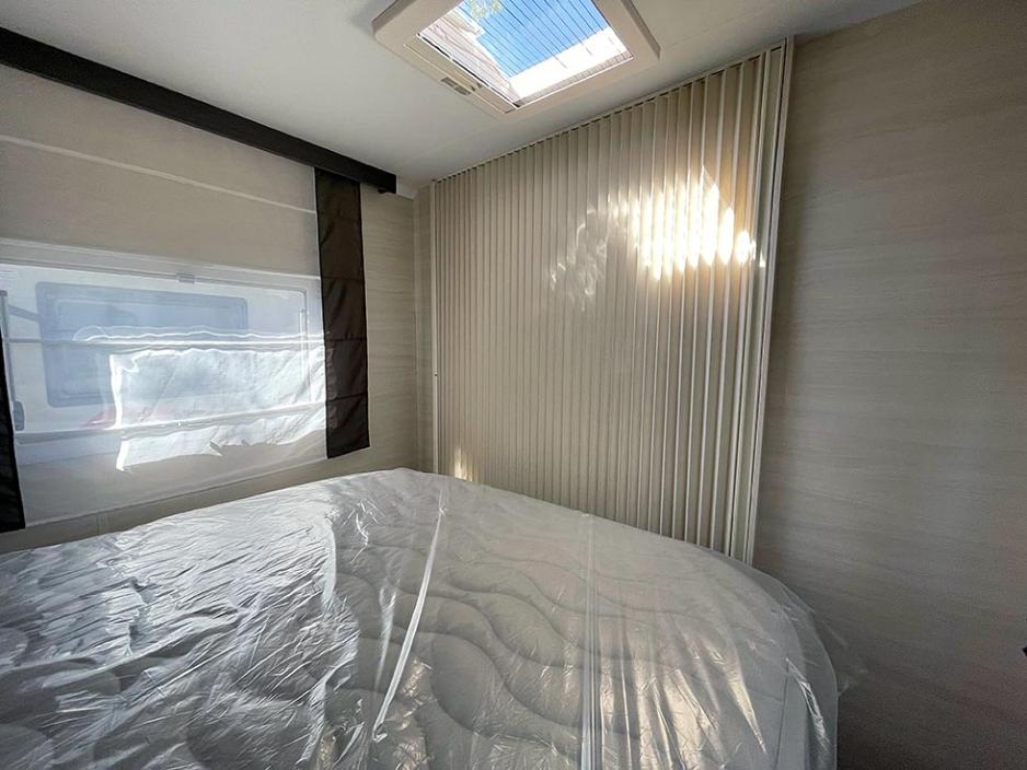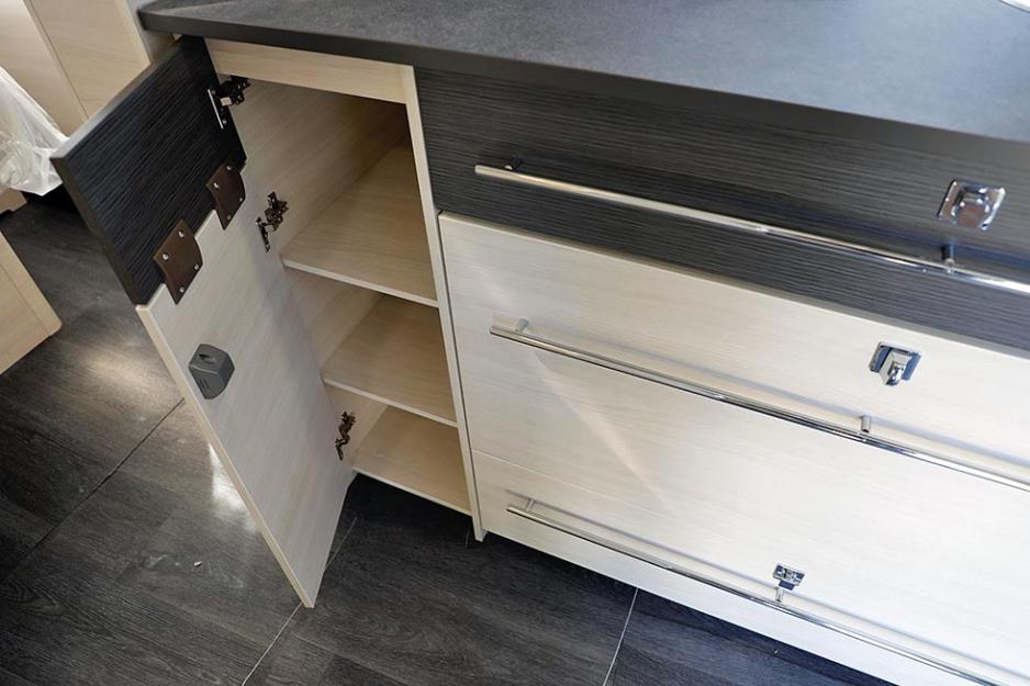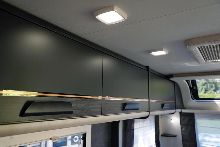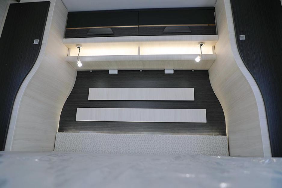 Myke linjer på sideskapene i hodeenden bekrefter at dette er en vogn hvor produsenten har lagt inn både tid og penger på designet. Spotlys på svanehals går igjen flere steder i vogna, og her er rikelig med indirekte lys. Jeg liker godt taklysene som er store firkantede og gir masse godt lys. Personlig synes jeg den gullfargede dekorlisten på overskapene gjør at det blir for mye av det gode, men det er en smakssak.