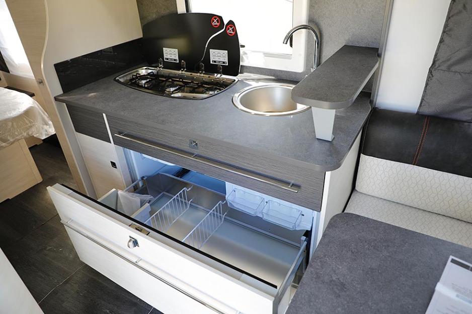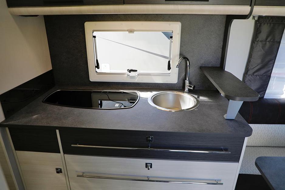 Jeg visste at Caravelair den siste tiden har gått for en designmessig sjarmoffensiv, og det er Artica 540 et godt eksempel på. Grå flater på benker, overskap, kjøkkenplate og bord. Og tofargede tekstiler med synlige sømmer, gir et flott førsteinntrykk.