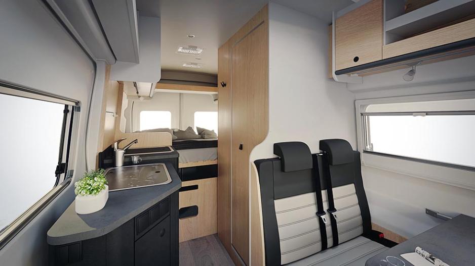 Interiørløsningen er ikke like ekstrem som resten av bilen. Det er brukt en tradisjonell løsning med tverrstilt seng bakerst, med bad, kjøkken ved skyvedør og spiseplass for fire.