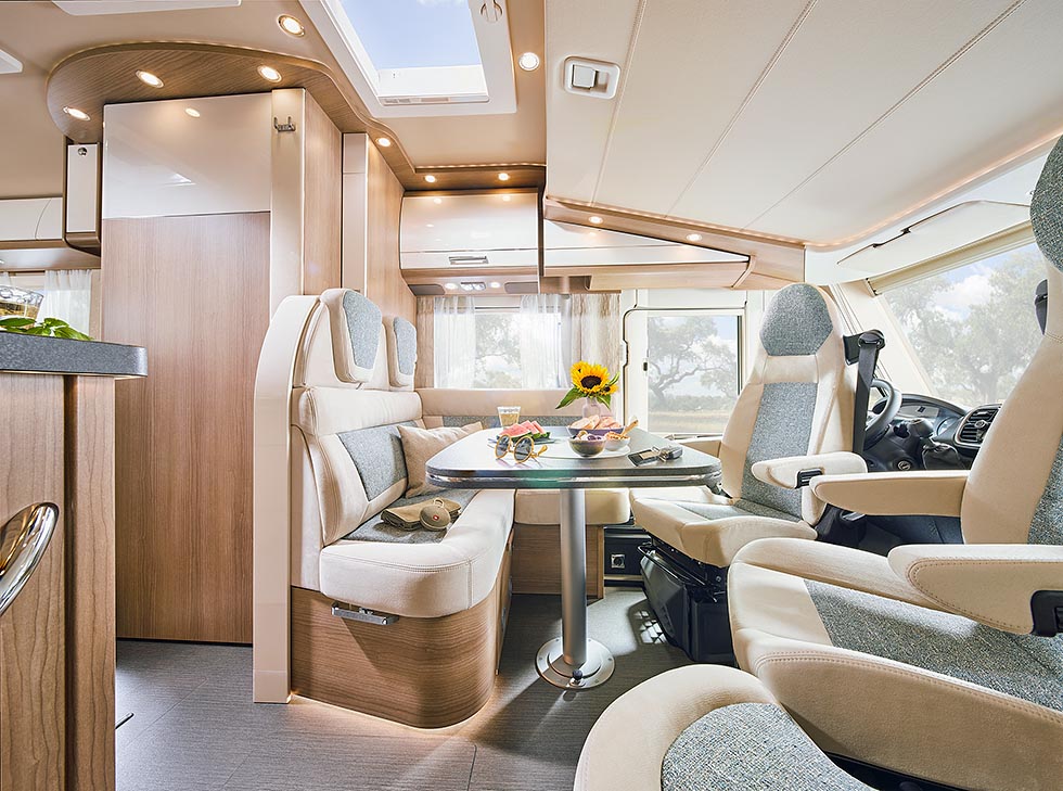Men vi skal ikke kimse av interiørdesign. Carthagos nyeste heter Casablanca, og preges av lyse og lette farger. De sandfargede nyansene har en moderat kontrast i innfelte grå tekstiler på alle sitteplasser. Den trefargede dekoren er i en mellombrun tone. Egentlig er det nye interiøret en blanding av den eksisterende Noble Cherry møbelinnredningen og skapdører i høyglans elfenben. Casablanca fås foreløpig kun på C-Compactline. Denne serien har en bredde på kun 212 centimeter, og det lyse interiøret er utviklet spesielt for å skape en enda bedre romfølelse, forteller produsenten.