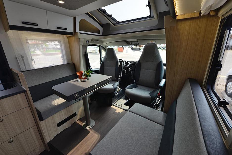 Nytt for 2023 er en kort (5,99 m) modell kalt C60 SP. En av modellens finesser vi likte godt var den uttrekkbare sidesitteren rett innenfor bodelsdøra. Dette blir nok en høyt verdsatt fotskammel for den som sitter i det bakovervendte førersetet.