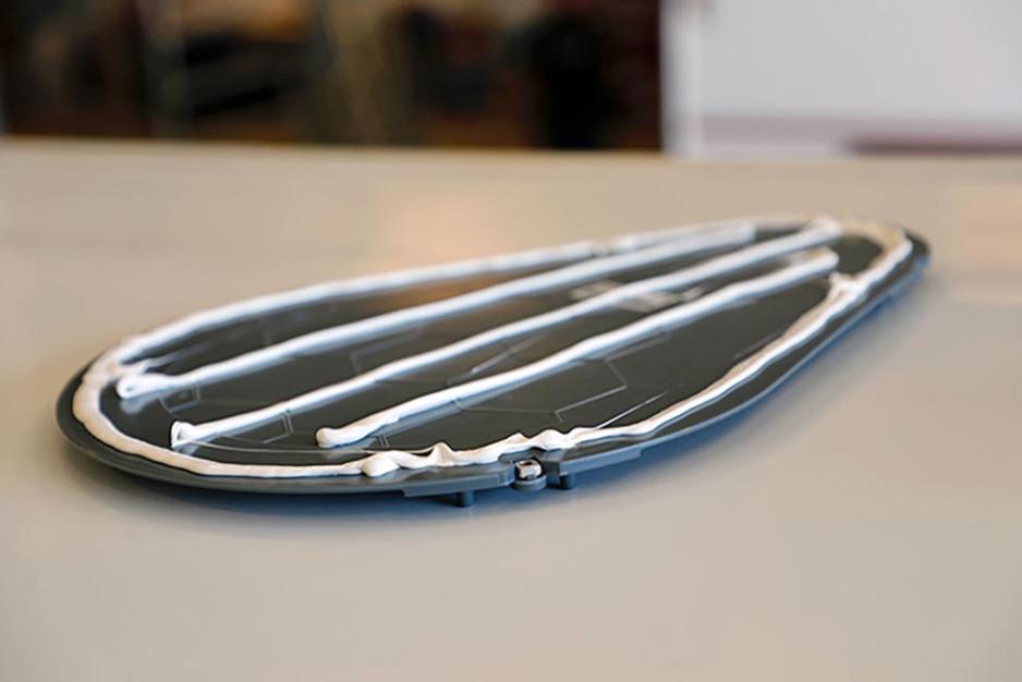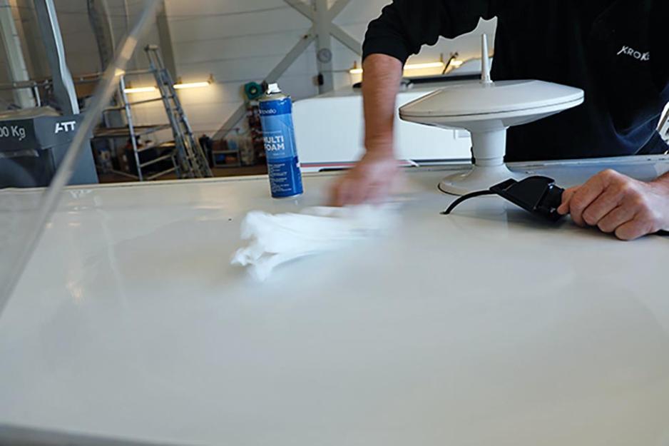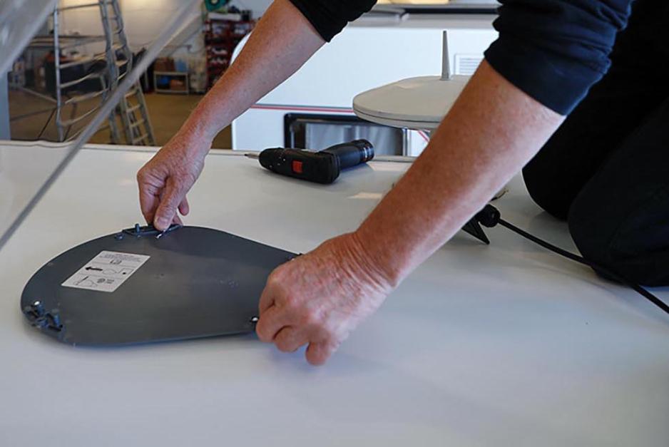 Selve enheten med antennen limes rett på taket. Roar presser ut all luft, og er ikke fornøyd før han ser limet tyte ut på alle sider. Fire skruer holder det hele stabilt. Når det både limes og skrus betyr det at bobilen ikke må stå i ro mens limet herder, forteller Roar.