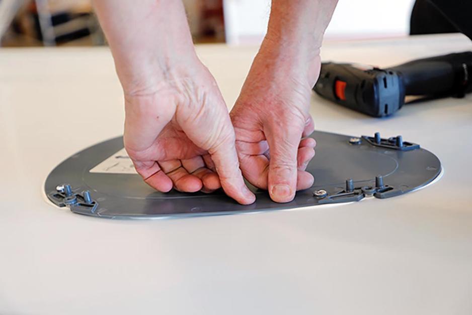Når den langt mindre kabelgjennomføringen skal festes gjøres det i to omganger. Først borres skruehullene og skruene festes halvveis, en etter en. Så demonteres alt, og rikelig med lim påføres. Nå er det lett å plassere klossen på rett plass og skru det hele til med riktig moment. Data-SIM-kortet monteres i selve antennen før denne skrues fast.