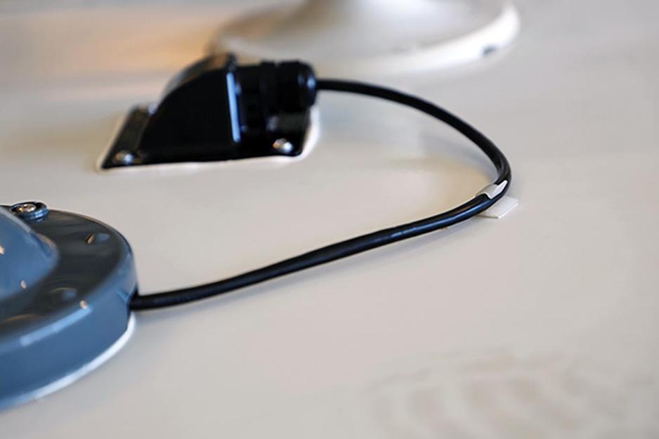 Mekaniker Roar er nøye med å måle nøyaktig plassering av hullet. Han har satt på et relativt tynt bor, til å lage selve hullet med. Når han er kommet gjennom, borer han det opp med et tykkere bor, slik at den litt brede kontakten i enden på ledningen får plass. For all kabling og alle kontakter er ferdig montert fra fabrikk. Den overskytende kabelen kveiles opp, og plasseres på et sted der det er til minst mulig sjenanse.