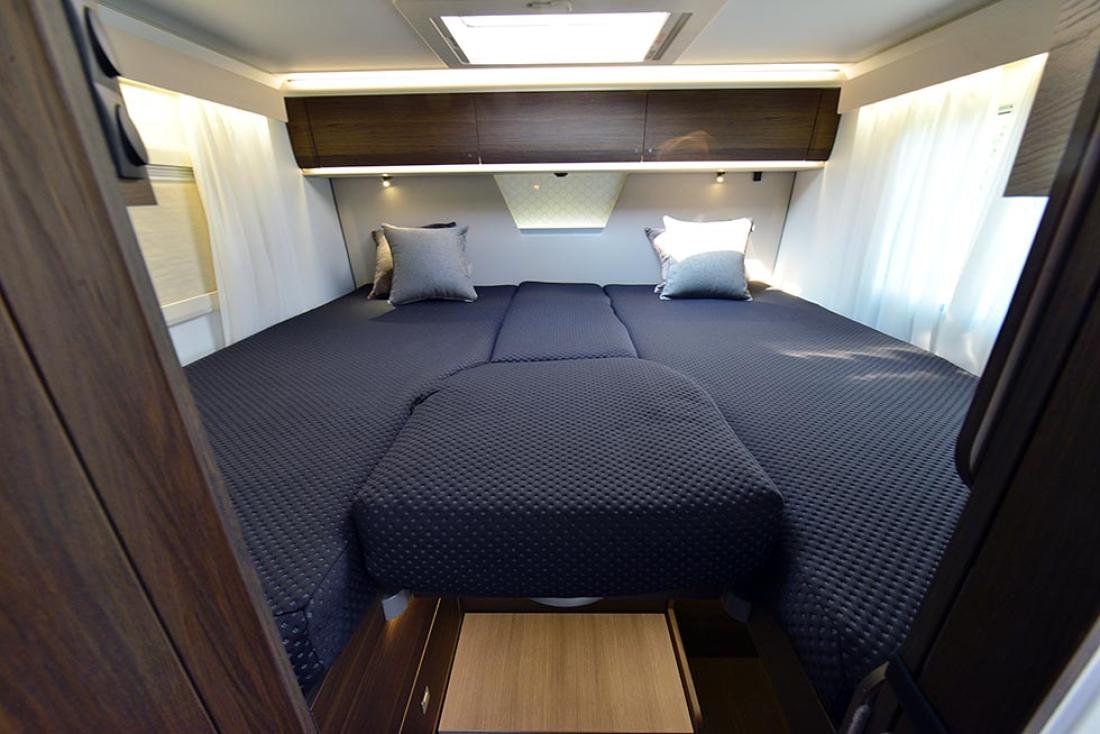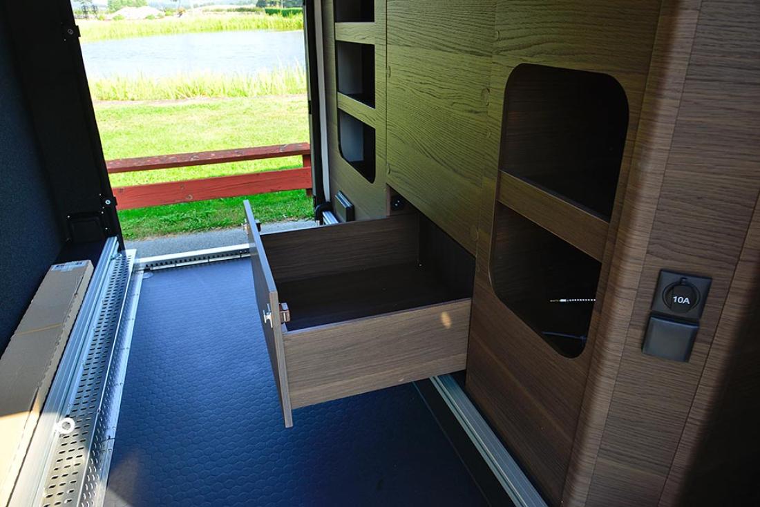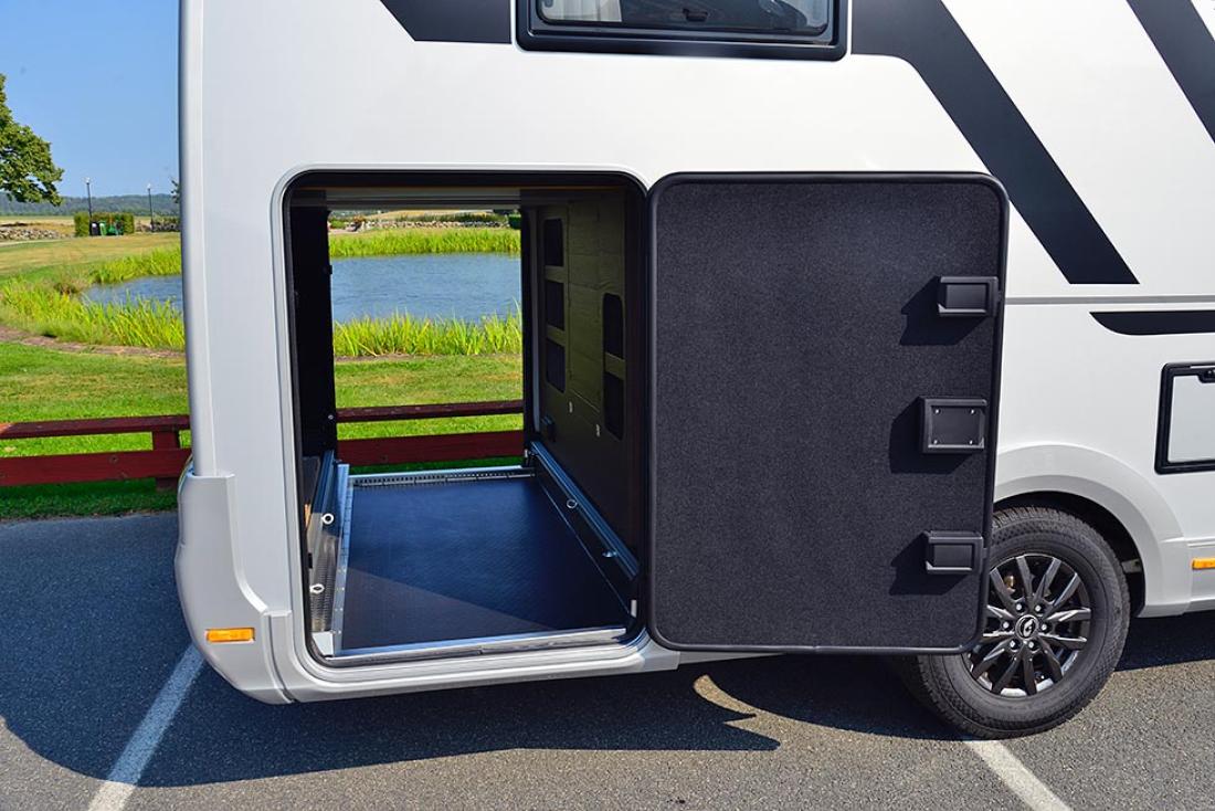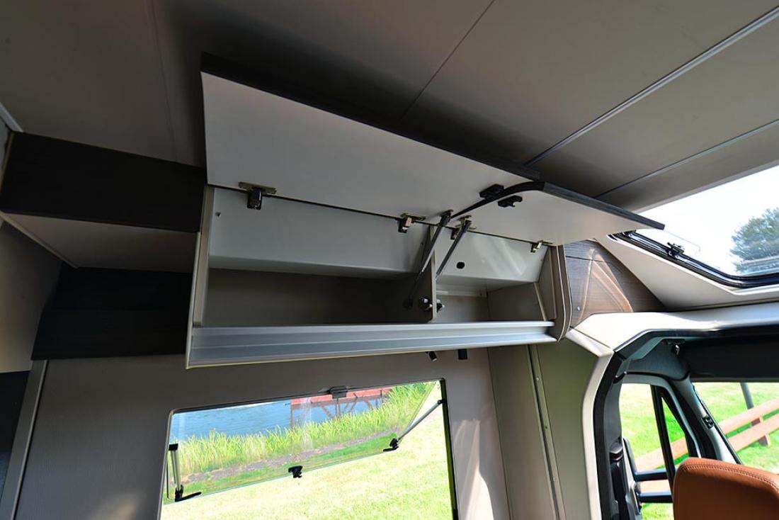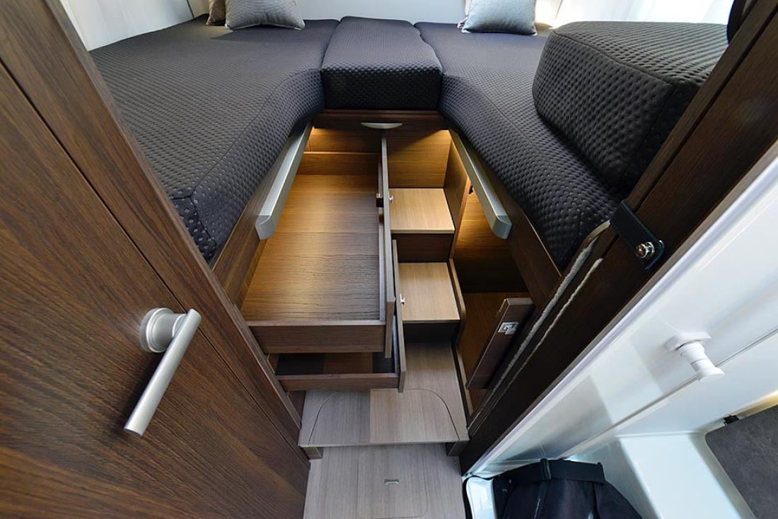 Garasjen er stor og godt innredet, her får man plass til en hel del. Under sengene finnes det en garderobe og to oppbevaringsskuffer. Det er ikke spesielt mange overskap, tre i soverommet og fire under senkesengen. Men der skal motoren til den elektriske senkesengen ha plass og det går på bekostning av plass til andre ting. Bilen har teknisk dobbeltgulv, men dette kan ikke benyttes til lagring. Er man to om bord er det grei lagringsplass, men for en familie på fire krever det god planlegging.