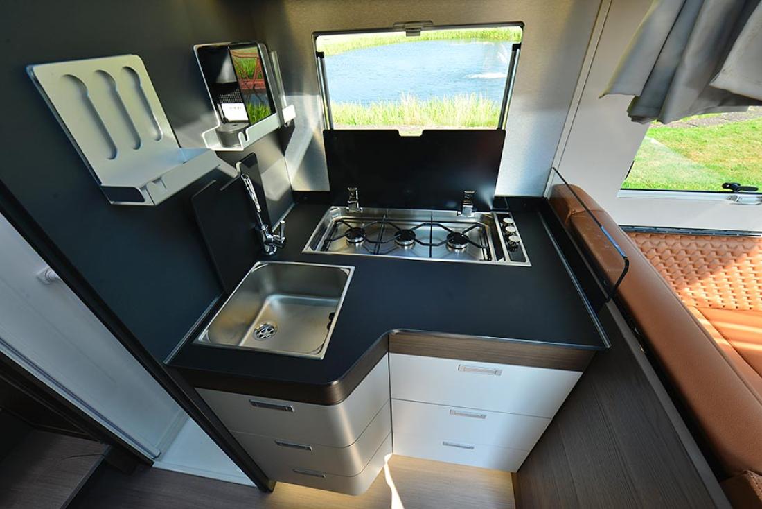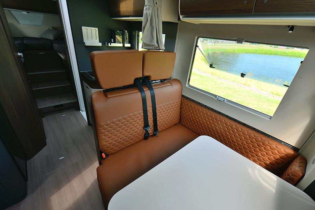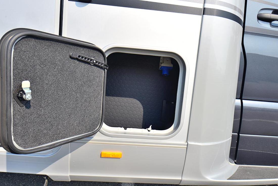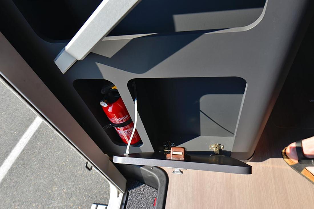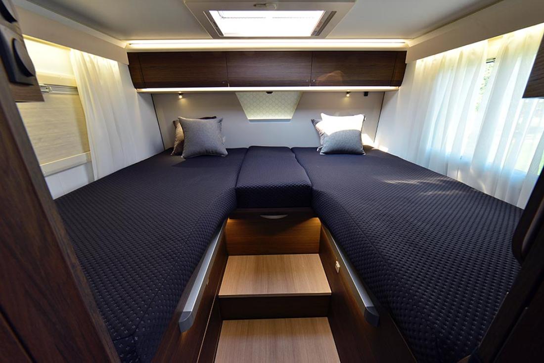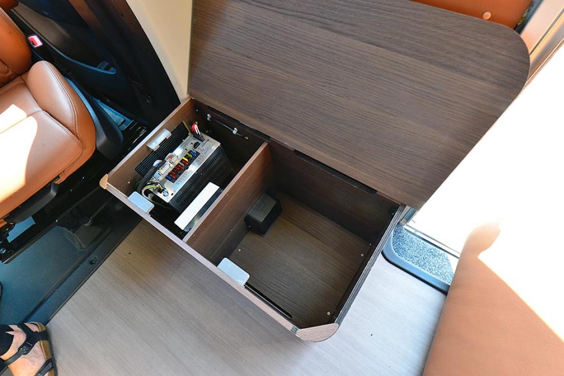 Garasjen er stor og godt innredet, her får man plass til en hel del. Under sengene finnes det en garderobe og to oppbevaringsskuffer. Det er ikke spesielt mange overskap, tre i soverommet og fire under senkesengen. Men der skal motoren til den elektriske senkesengen ha plass og det går på bekostning av plass til andre ting. Bilen har teknisk dobbeltgulv, men dette kan ikke benyttes til lagring. Er man to om bord er det grei lagringsplass, men for en familie på fire krever det god planlegging.