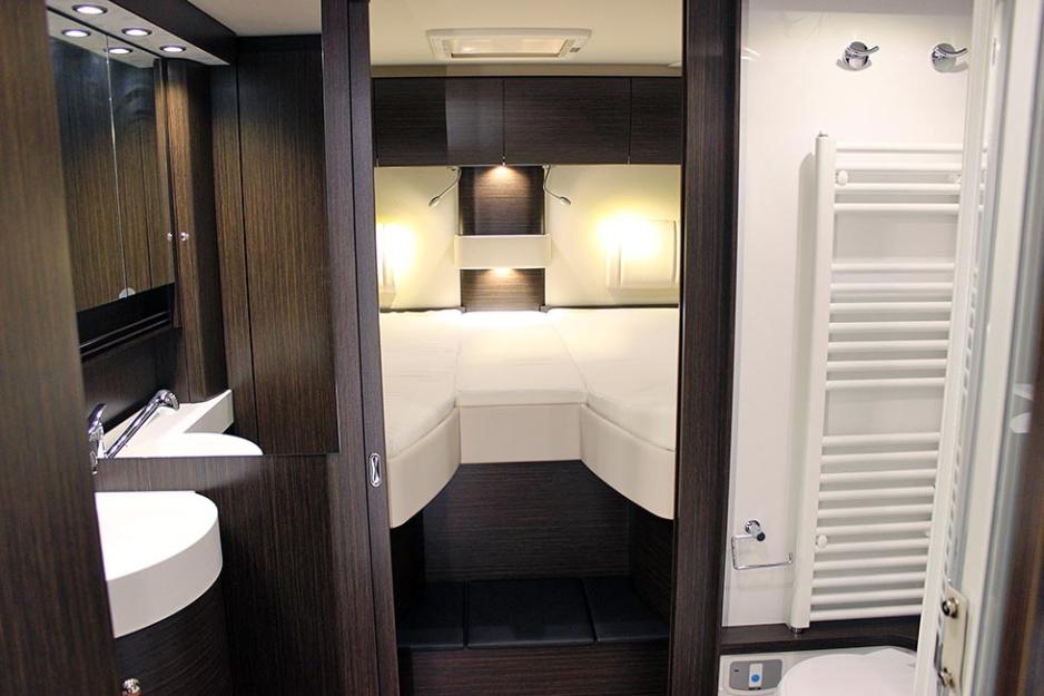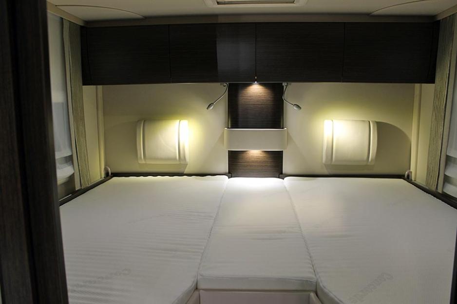 Soveværelset bak har to enkeltsenger med målene 200 x 84 cm. Mellomrommet har en madrass, i en lengde på 150 cm og den er 38 cm bred. På grunn av garasjens bredde på 150 cm kan du altså ikke gå lenger inn mellom sengene. Du må opp på et noe høyt trinn og sette deg relativt langt nede i sengen. Adkomsten til sengene er med andre ord ikke fullt så komfortabel som i mange andre biler med enkeltsenger bak. Sett fra det romslige toalettrommet virker soveværelset noe trangt, selv om sengene er godt dimensjonert.