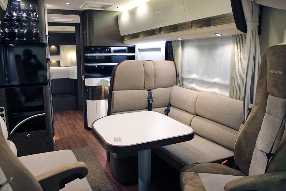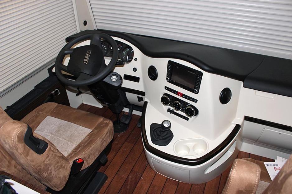 Fra overkant dashbord og ned til gulvet har Concorde laget en egen vegg for betjening og instrumenter. Dette hindrer kulderas som er problemet ved originalutførelse. Gulvet er flatt herfra og hele veien til soveværelset bak.