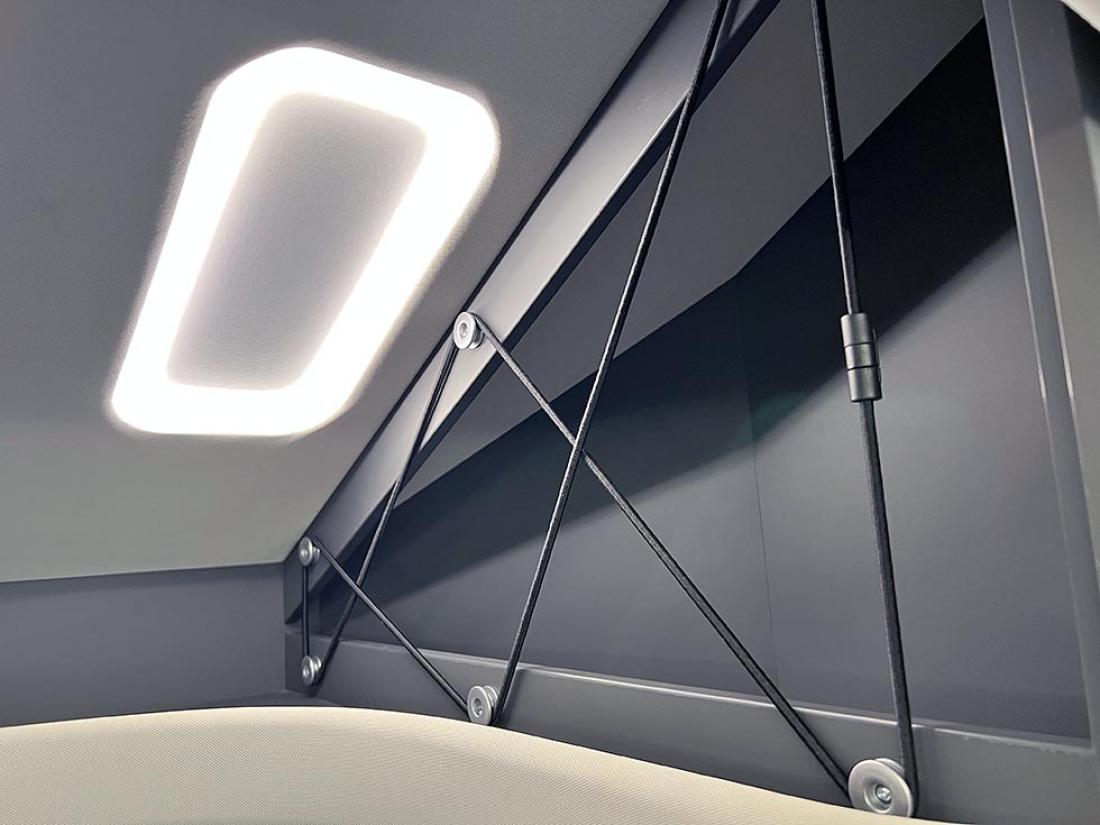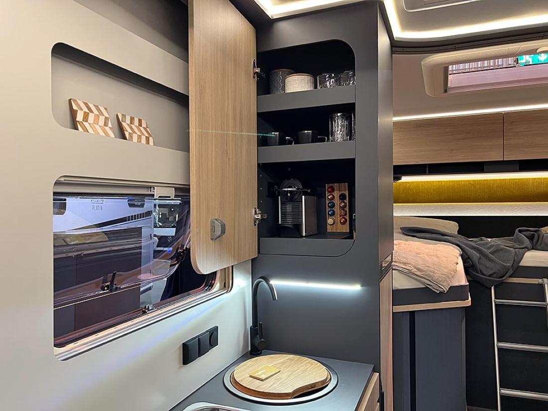 Selv oppgir Frankia tre punkter som gjør modellen unik: plass, design og lys. Her er ingen gardiner eller trappetrinn. Og det er kun overskap på soverommet. Jeg kjenner igjen mye av tankegangen fra Neo. Frankia puttet inn mye energi og utviklingsressurser i den halvintegrerte modellen da den ble lansert i 2019. Blant annet var det gjort mye for å gjøre modellen lettere, og det kjenner man igjen på Now. I stedet for overskap er det hyller og strikker. Det sparer vekt og gir en luftig følelse.