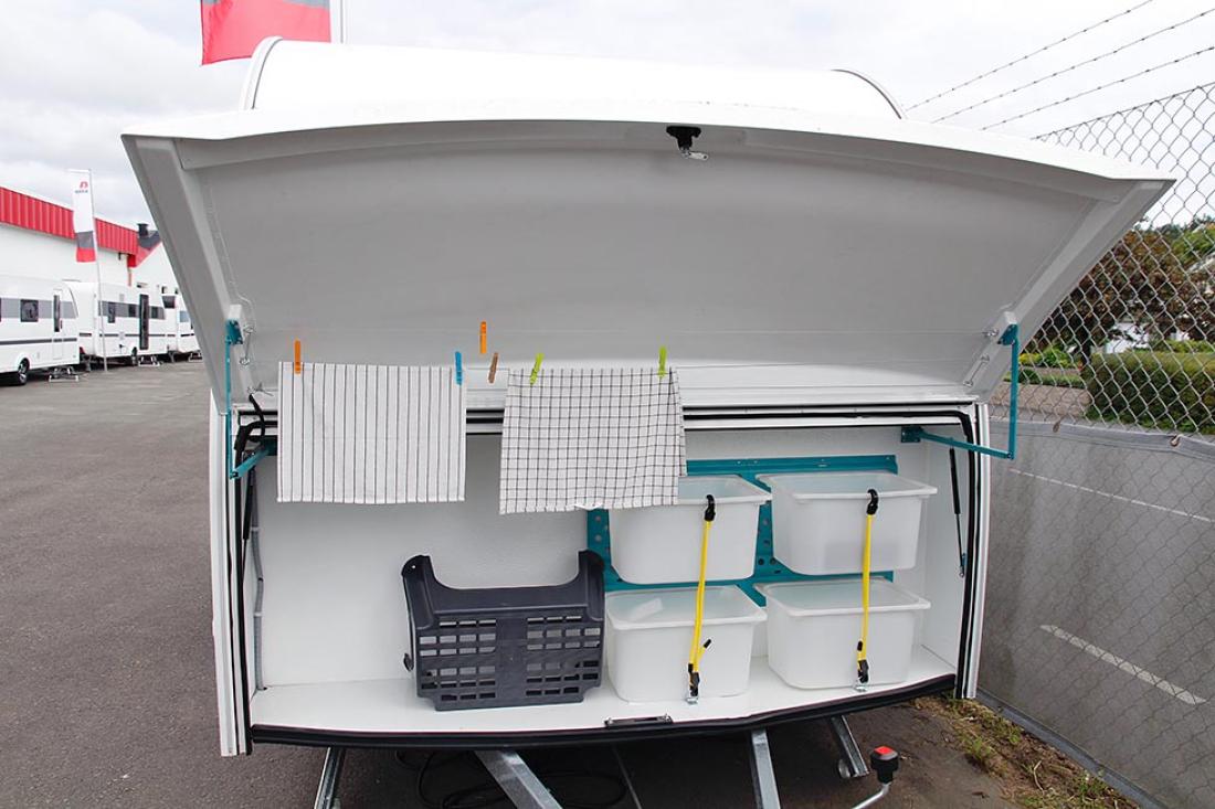 Dette er en modell som har vært på markedet tidligere, men i 2024-utgave er det en helt ny vogn innvendig. Selv om også dette er en kompakt vogn har den en romslig følelse innvendig. I tillegg er det flere praktiske løsninger, som at sofaen kan gjøres om til en 90 cm bred seng. Dermed er det soveplass til tre i kombinasjon med en tverrstilt dobbeltseng. Men det som gjør at denne modellen skiller seg ut er det stooore vinduet som kan åpnes helt opp. Det gjør at skillet mellom naturen der ute, og kjøkkenet og bordplassen inne nærmest blir visket ut. Modellen har både en Truma luftvarmer og en koketopp på gass. Og ikke minst er det meget lyst og trivelig.