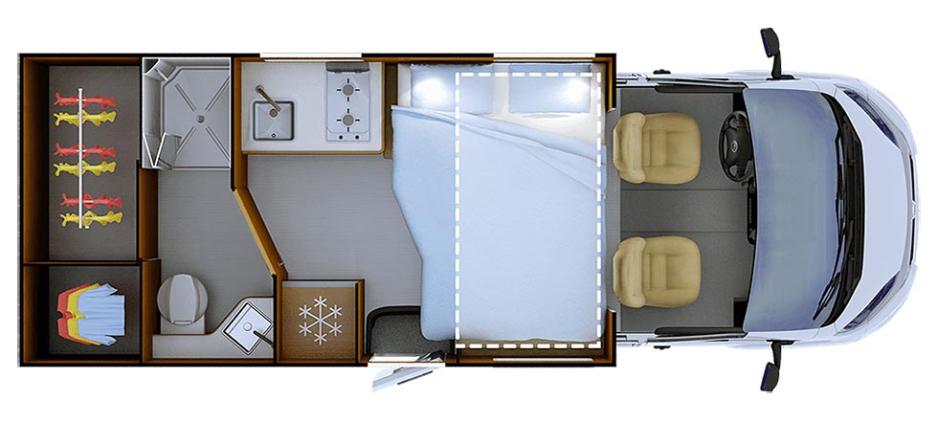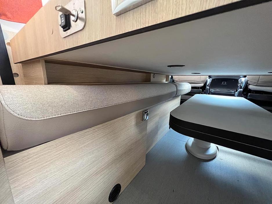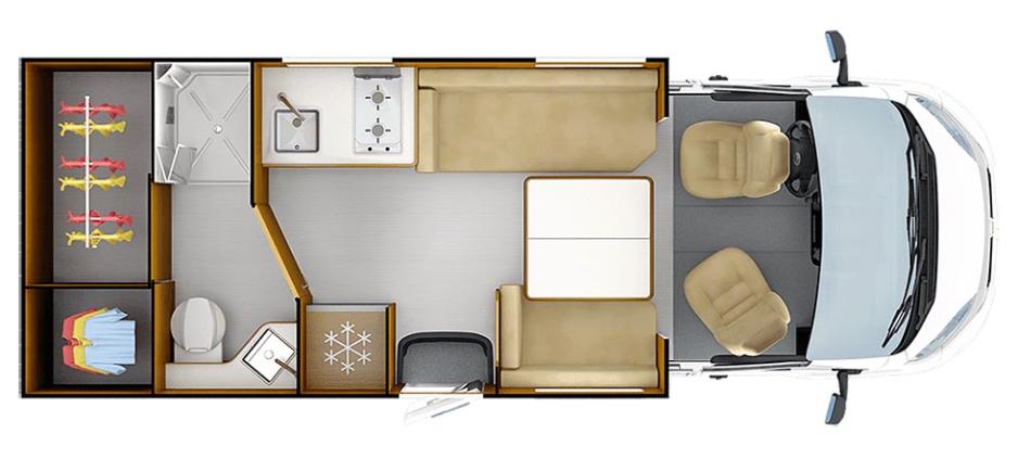 Å ha en kompakt, men likevel romslig bobil er noe alle ønsker. Denne modellen oppfyller dette ønsket for to personer. Sittegruppen er romslig og den ene sidesitteren er lang nok til en ettermiddagslur. Badet og skapløsningene er imponerende. Designet går i lyse farger med svarte kontrastdetaljer, og det er lett å trives.