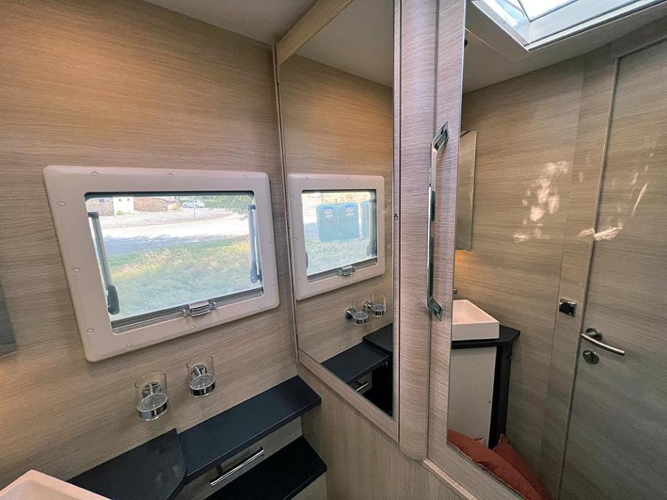 Skapløsningen helt bakerst på badet er ganske så unik. Normalt ligger soverommet her, i stedet har Rapido laget et imponerende romslig bad her. En stabil dør gir rommet nødvendig privatliv når man ønsker det. To takluker og et vindu bidrar med mye naturlig lys på rommet.