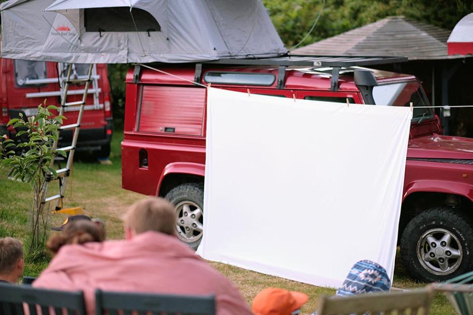 En av de beste tingene med denne prosjektoren, er at den gjør det mulig å ha utendørs kinokvelder der du camper. På en av turene i sommer var vi en stor gjeng med venner og familie som campet sammen, og da arrangerte vi nettopp en slik utendørs kinokveld. Vi lagde en stor skjerm på enkleste mulige måte. Vi hang opp et dobbelt hvitt laken foran en av bilene, plasserte stoler i en halvsirkel og la et teppe på bakken. Dermed var det plass til fler enn 20 personer foran skjermen. Sammen nøt vi en familievennlig film under åpen himmel.