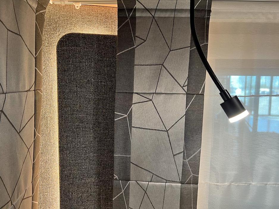 Gardinene som dekker vinduene på soverommet, er gjennomsiktige. Det beskytter mot innsyn, samtidig som de slipper inn mye lys. De suppleres av hver sin lille gardinbit på to sider. Disse har et kraftig mønster, og gjør unødvendig mye ut av seg. Likevel er helheten her innendørs ganske så nedtonet.